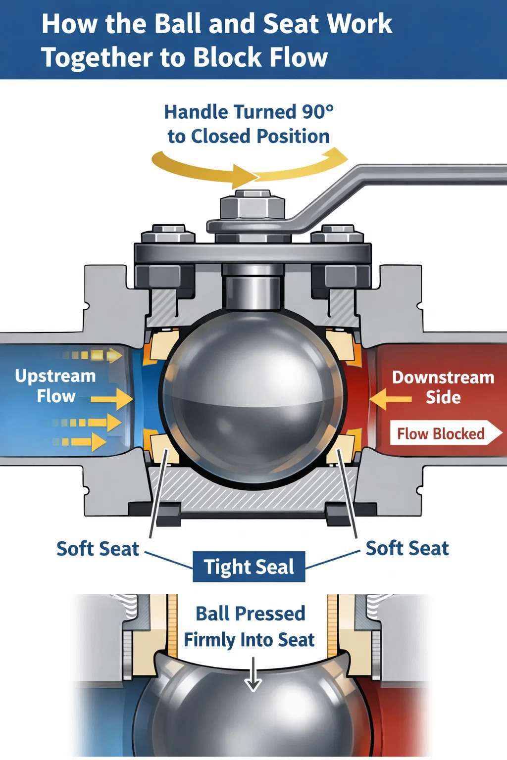 Шар как со стороны входа, так и со стороны выхода окружают седла клапанов — кольца, изготовленные из таких материалов, как ПТФЭ (политетрафторэтилен), ПЭЭК (полиэфирэфиркетон) или армированный нейлон. Эти седла обработаны так, чтобы соответствовать кривизне шара с очень жесткими допусками, как правило, От ±0,001 до ±0,005 дюйма в зависимости от класса давления. Седла удерживаются под небольшой пружиной или механической предварительной нагрузкой, так что еще до приложения давления в системе шар уже находится в контакте с материалом седла по всей своей окружности.