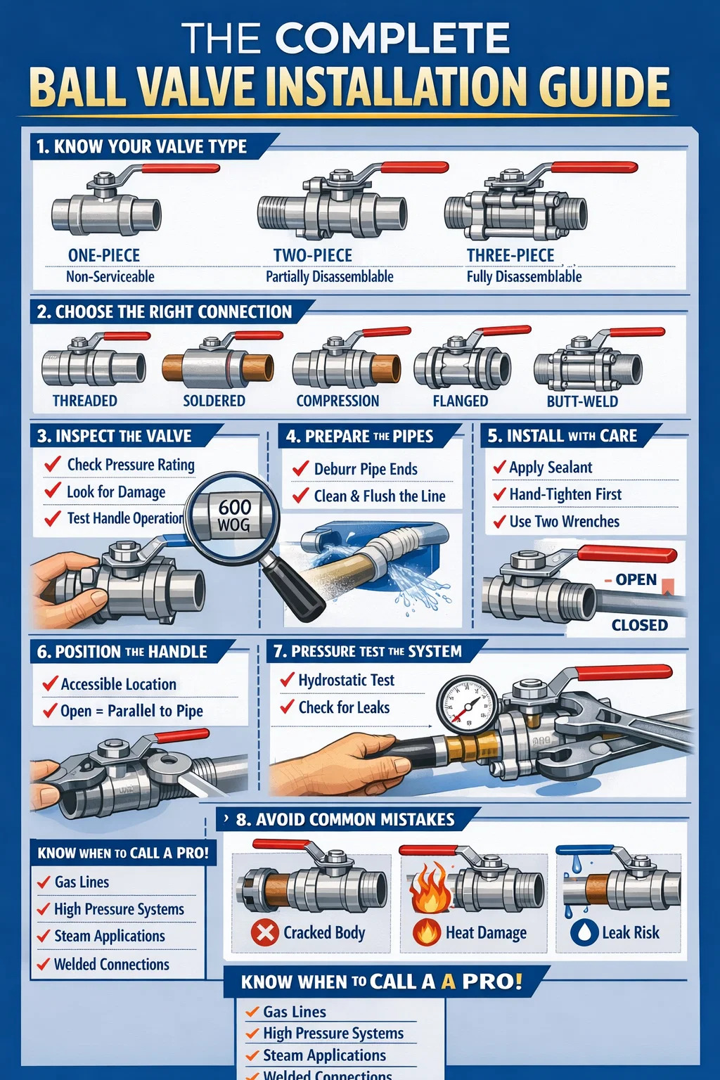 Шаровые краны доступны с резьбовыми (NPT или BSP), паяными (пот), компрессионными, вставными, фланцевыми концами и концами под приварку. Каждый из них требует совершенно разного метода установки: