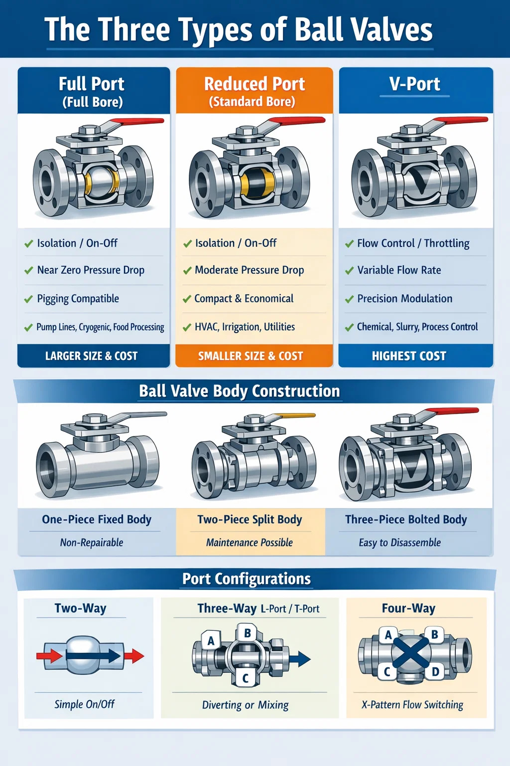Шаровые краны В зависимости от конструкции канала ствола они подразделяются на три основных типа: полнопроходные (полнопроходные), уменьшенные (стандартные) и V-образные шаровые краны . Каждый тип служит различным целям управления потоком в промышленных, коммерческих и жилых трубопроводных системах. Понимание этих различий важно перед выбором клапана для любого применения, поскольку выбор неправильного типа может привести к потере давления, ограничению потока или преждевременному выходу оборудования из строя.
